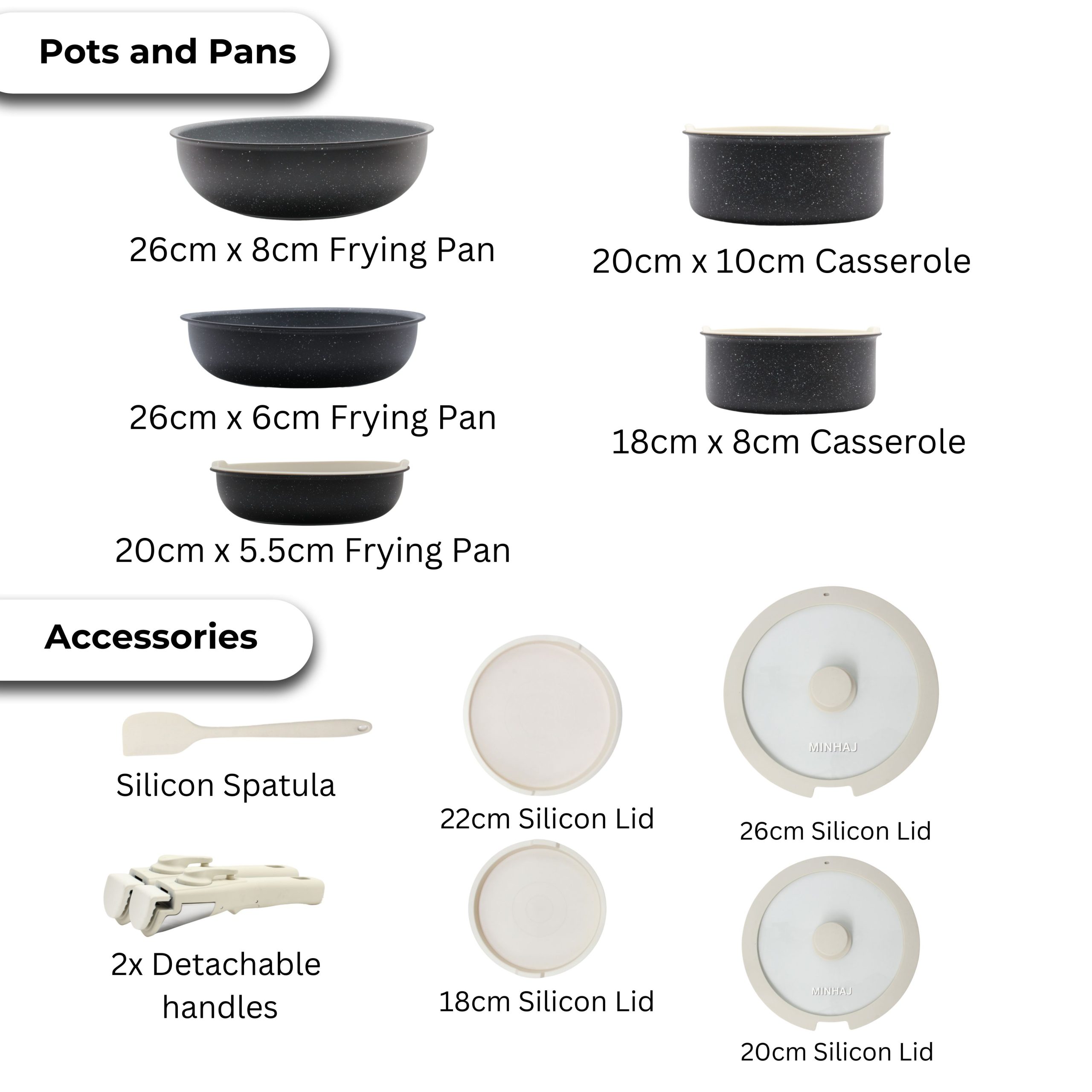 Upgrade your kitchen with this innovative, space-saving cookware set designed for modern living. The detachable handles allow the pots and pans to stack neatly, saving up to 70% storage space while keeping your cupboards clutter-free.