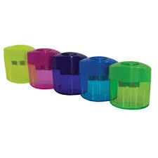 Barrel container catches shavings for mess-free sharpening. Comes in assorted colours.
