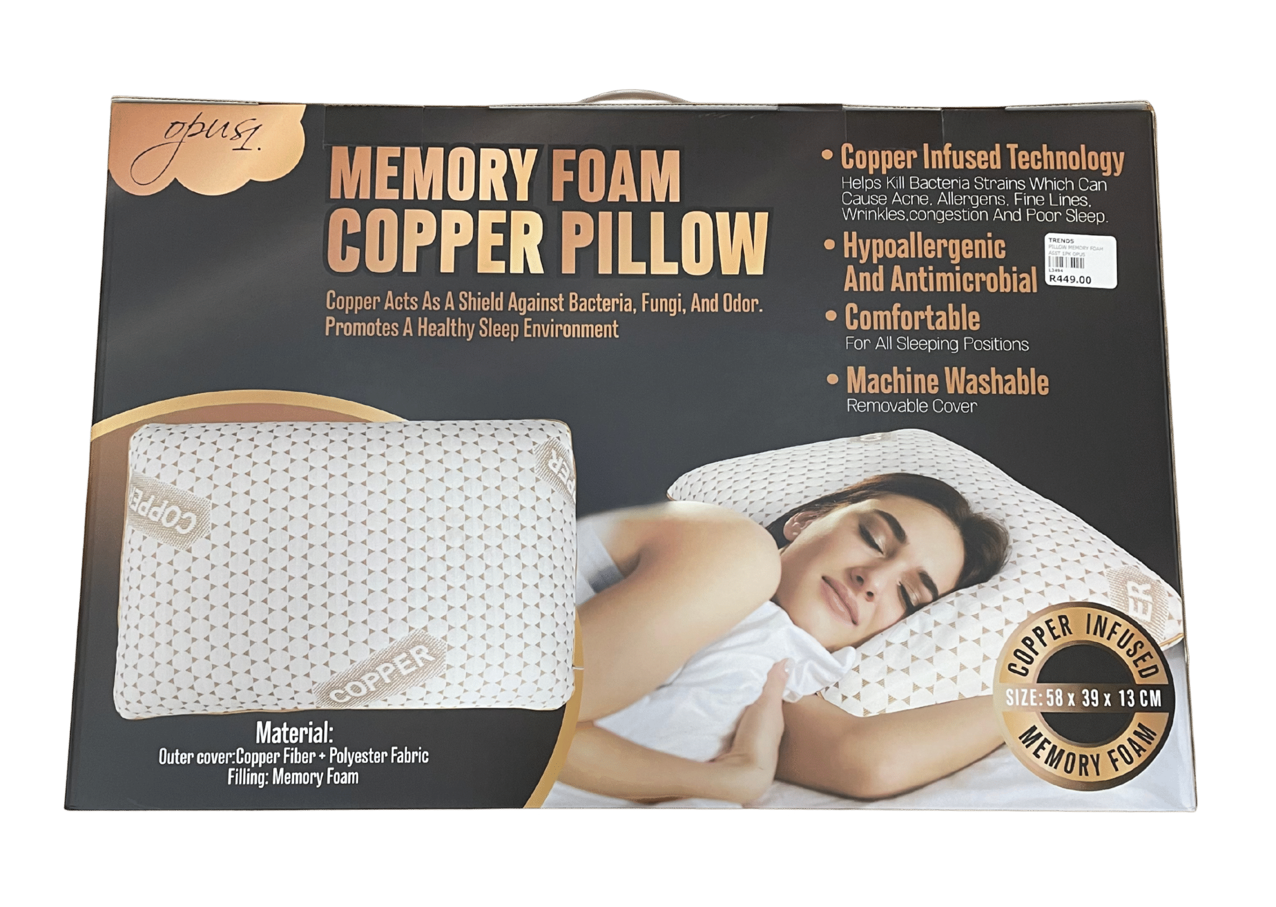 The Copper Memory Foam Pillow features copper-infused memory foam that helps eliminate bacteria, allergens, fungi, and odors for a cleaner, healthier sleep environment. Its antimicrobial and hypoallergenic properties make it ideal for sensitive skin and those prone to acne or allergies. Designed for comfort and optimal support, it contours to your head and neck for a restful night’s sleep. The removable cover is soft, breathable, and machine washable for easy care. Enjoy freshness, comfort, and long-lasting protection every night.