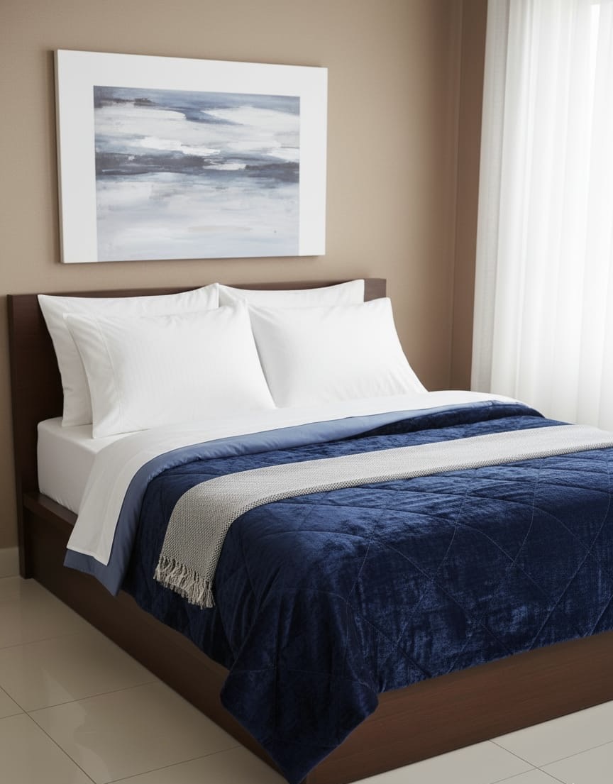 Luxuriously soft with a rich crinkled texture, this navy velvet(polyester)quilt adds elegance and warmth to any bedroom.
