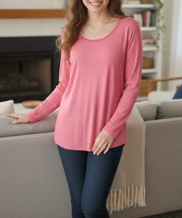 LDS L/S PLAIN INNER TOP W/ LACE RIBBON NECK -PINK