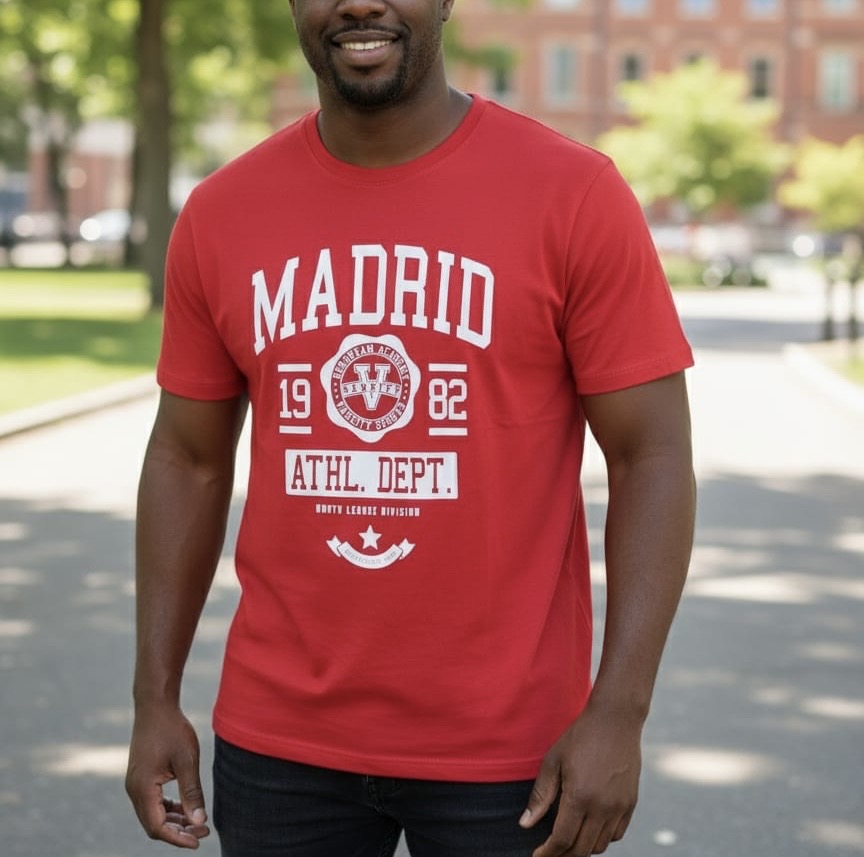 Classic short-sleeve design made from soft, breathable fabric. Features a stylish Madrid-inspired print for a modern casual look.