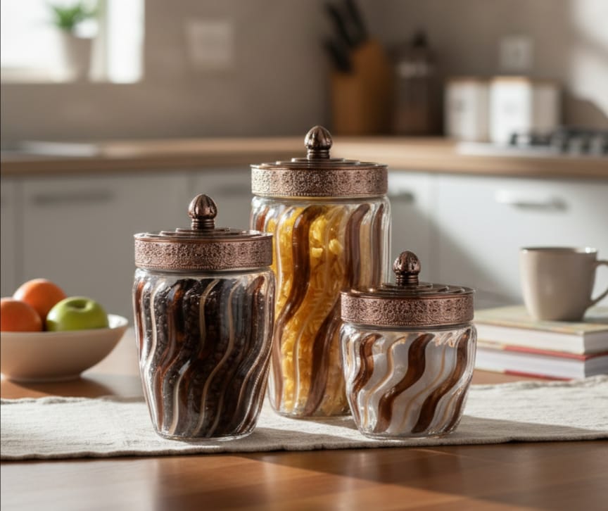 Royal Homeware glass storage jars – 3-piece set: a stylish and practical solution for organizing your kitchen essentials. These clear glass jars make it easy to see contents at a glance, keeping ingredients fresh and accessible. Each jar comes with a secure lid to lock in flavor and protect against moisture. Perfect for storing dry goods like cereals, grains, spices, snacks, and more. Durable, easy-to-clean design ideal for pantry or countertop use.