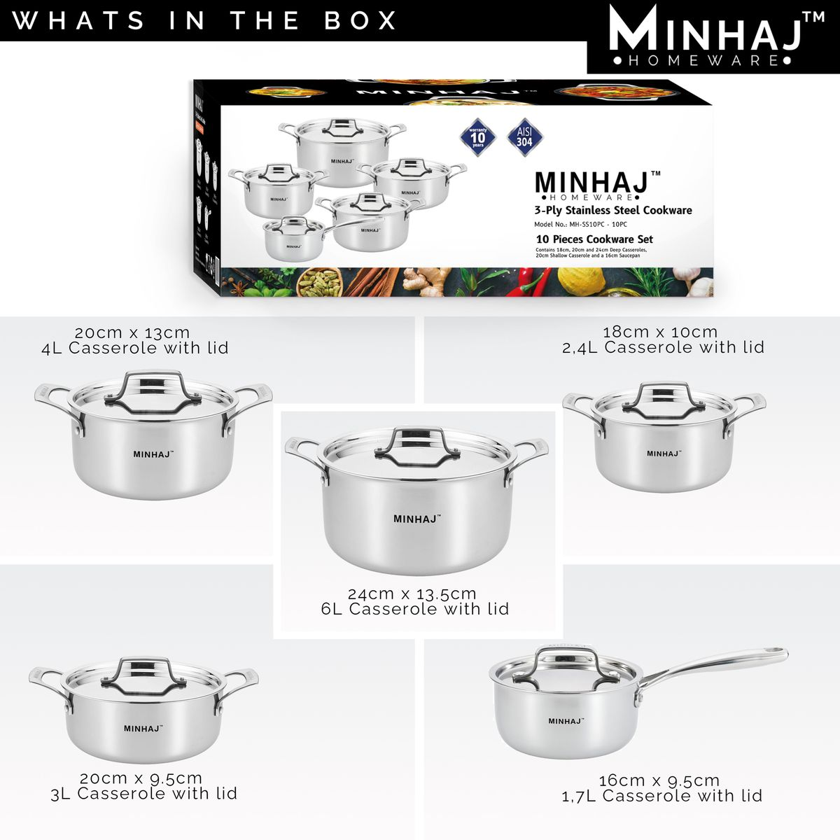 Elevate your culinary experience with the Minhaj 3-Layer Stainless Steel Cookware Set, an essential collection designed to meet all your everyday cooking needs. This versatile set includes: